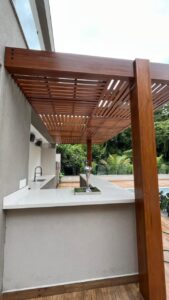 Nossos pergolados são construídos com madeira de lei cumaru, mesma matéria-prima utilizada nos decks.